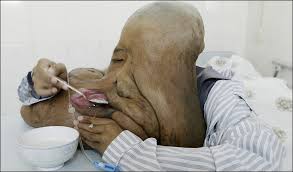 Kondisi dan foto-fotonya yang aneh tersebar ke seluruh dunia dan ini sangat mengejutkan. Huang Chuncais pun kemudian populer dengan sebutan ‘Chinese Elephant Man.Tumor seberat 15 kg telah menarik kulit wajahnya sehingga berbentuk aneh. Ini membuat Huang sangat menderita, bahkan untuk makan pun dia harus bersusah payah. Berkat fotonya yang dipublikasi secara luas, ia pun mendapatkan tawaran operasi denganbebas biaya. Adalah dokter di Fuda Cancer Hospital di Guangzhou yang menawari bantuan itu. Tentu saja operasi ini tidak bisa hanya sekali, karena kondisinya kadung parah. Foto ini adalah salah satu yang diambil setelah operasi kedua, pada januari 2008. Masih belum sepenuhnya normal. Tumor yang mengelantung masih terlihat. Tapi Huang tak perlu khawatir karena pihak dokter akan mengoperasinya kembali sampai wajahnya kembali normal.